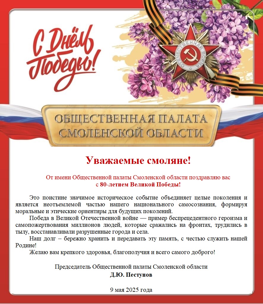 Денис Пестунов поздравляет жителей Смоленской области с Днём Победы!