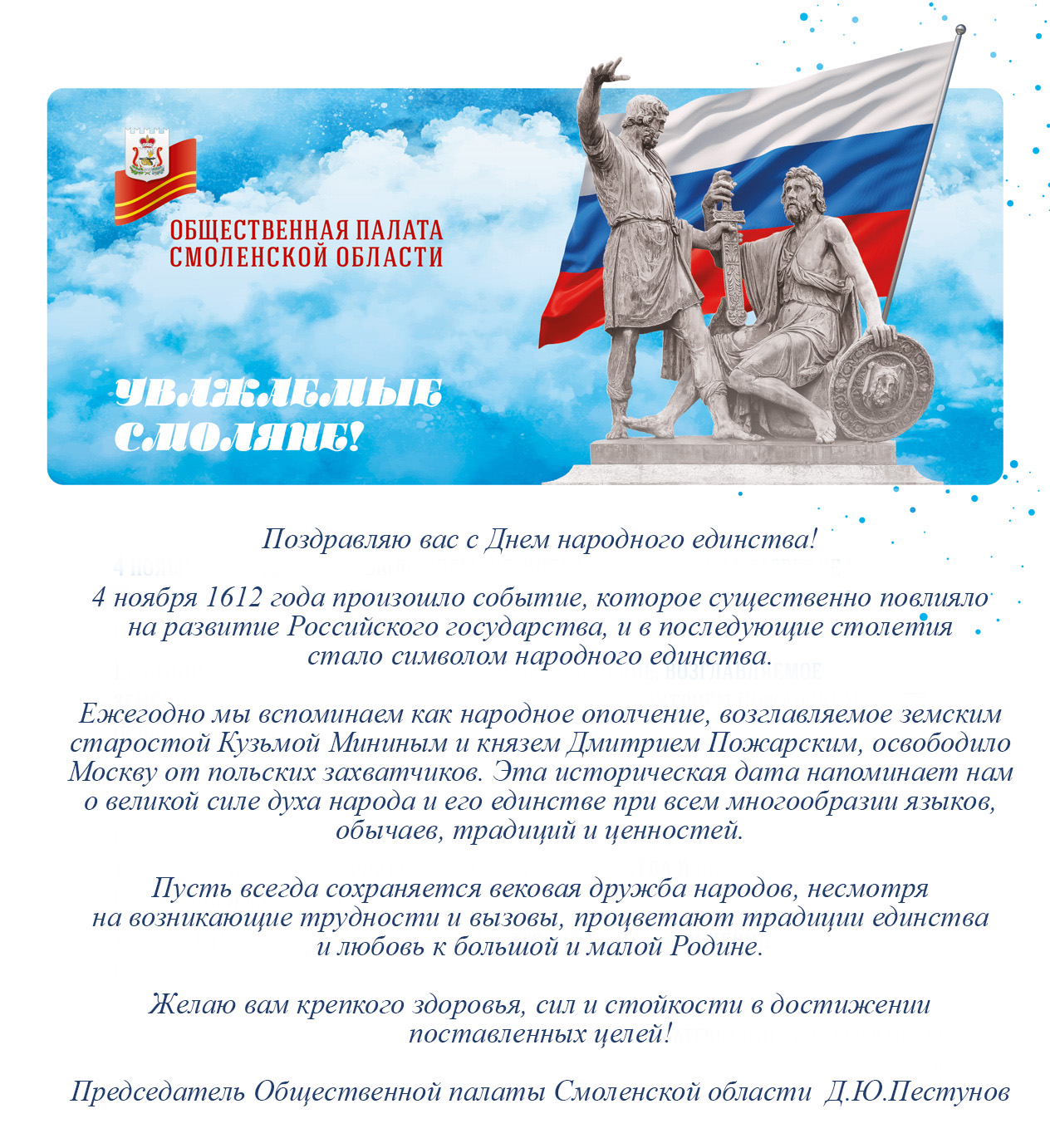 Денис Пестунов поздравляет жителей Смоленской области с Днём народного единства!